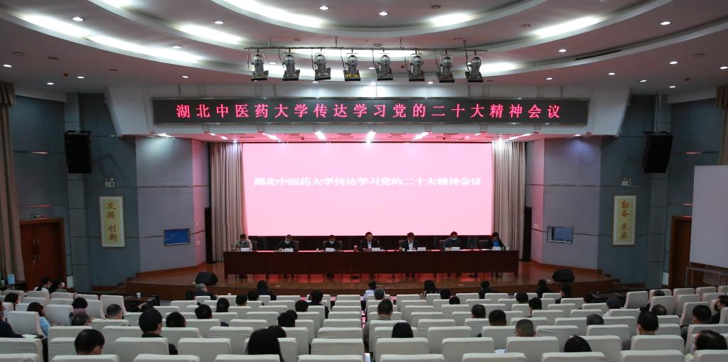 本网讯 10月26日,湖北中医药大学传达学习党的二十大精神会议在黄家湖校区明德楼学术报告厅举行。校领导,校党委委员,校纪委委员,副处级及以上干部,思政课教师、辅导员代表,“两代表一委员”,民主党派主委和统战团体负责人,师生代表参加会议。校党委书记唐峻主持会议并讲话。