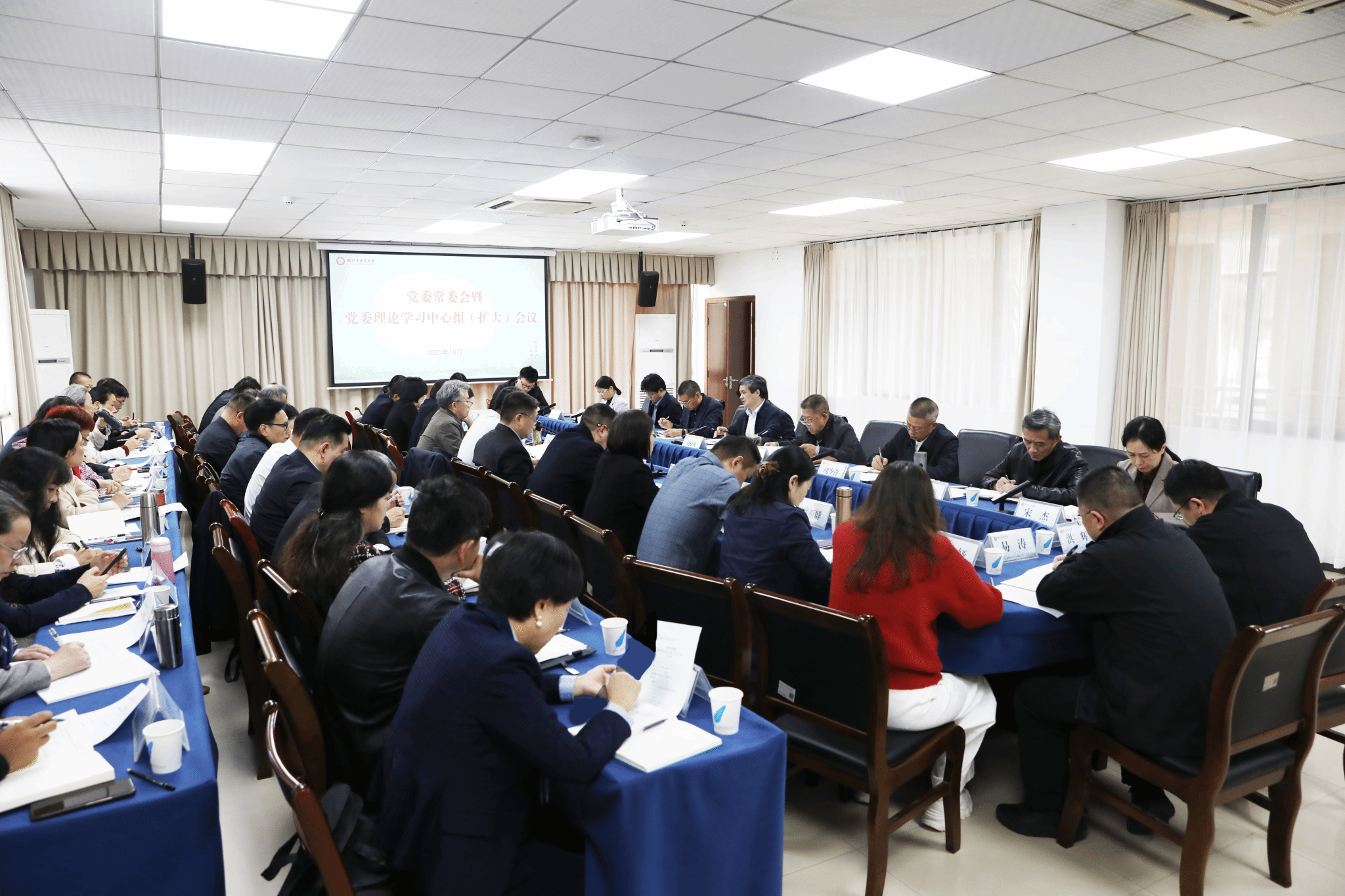 本网讯 10月29日,学校在黄家湖校区明德楼A座一楼会议室召开党委常委会暨党委理论学习中心组(扩大)会议,围绕学习贯彻《中国共产党思想政治工作条例》(以下简称“《条例》”)、落实意识形态工作责任制、建设平安校园等进行专题研讨。校领导,各单位负责人参加会议。会议由党委书记刘松林主持。