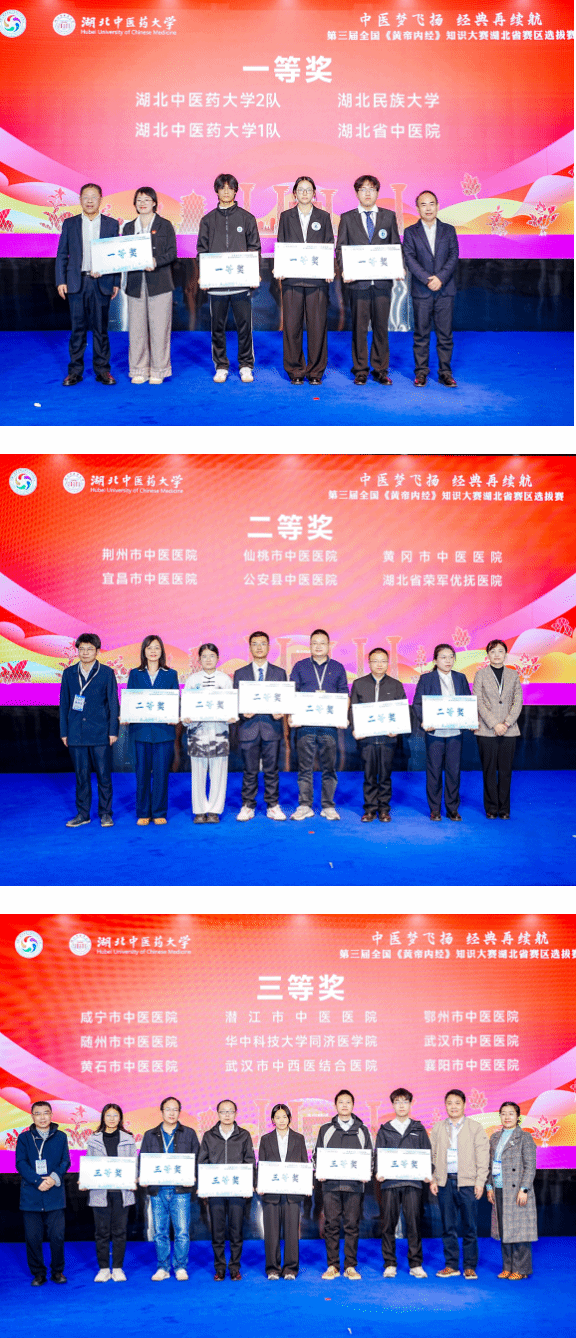经过激烈角逐,湖北中医药大学二队和一队、湖北中医药大学附属医院(湖北省中医院)队、湖北民族大学队获一等奖,荆州市中医医院队、宜昌市中医医院队、仙桃市中医医院队、公安县中医医院队、黄冈市中医医院队、湖北省荣军优抚医院队获二等奖,咸宁市中医医院队等9支队伍获三等奖;大赛评选出优秀指导老师19人、优秀选手41人。与会领导及嘉宾为获奖队伍颁奖。
