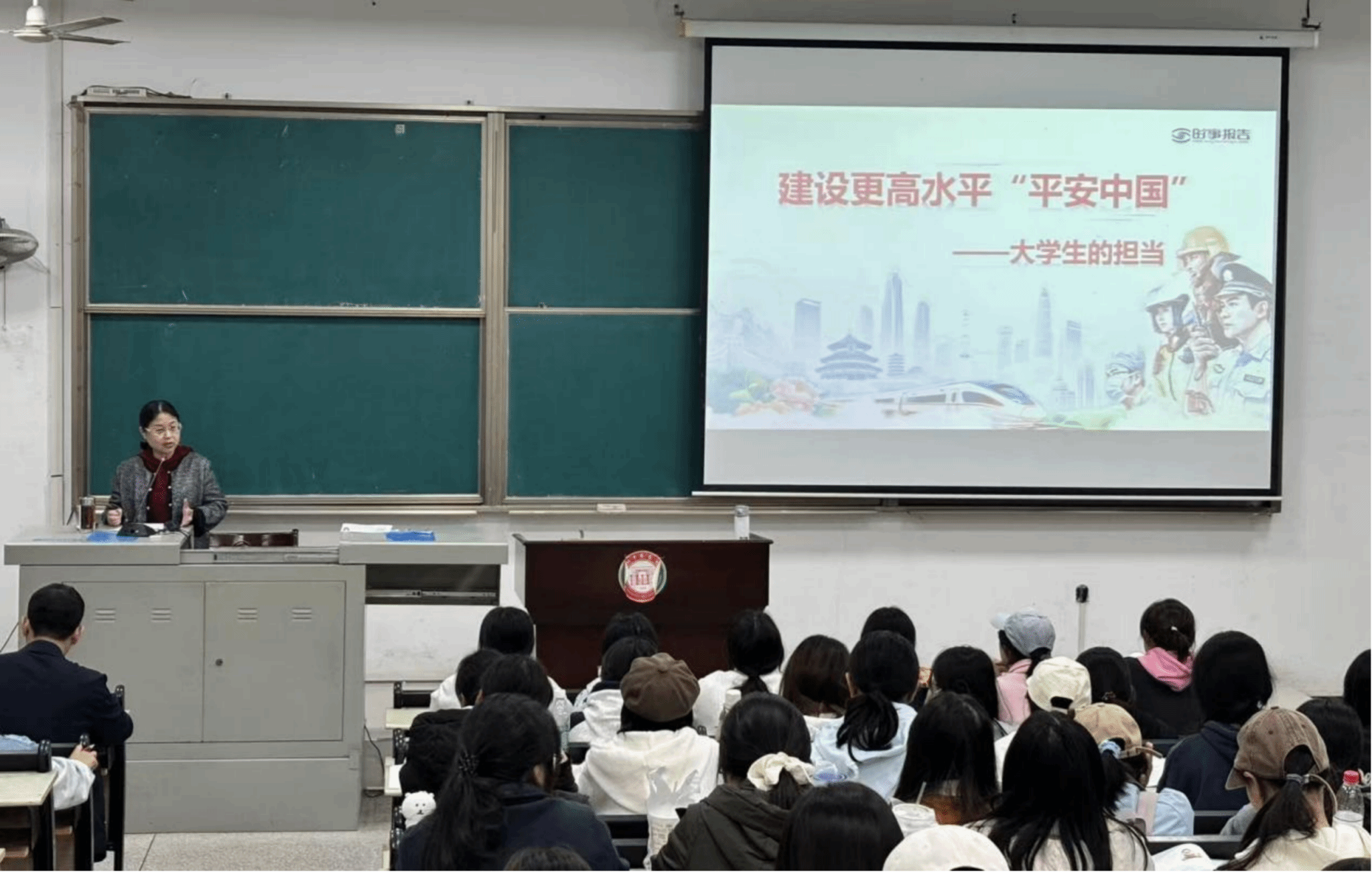 党委副书记、副校长蔡晓英为2025级汉语国际教育班、英语班授课。她结合党的二十届四中全会关于“推进国家安全体系和能力现代化,建设更高水平平安中国”的战略部署,讲解了平安中国的内涵、战略意义、新时代青年的时代使命等,号召同学们做平安理念的传播者、平安知识的学习者、平安环境的维护者。