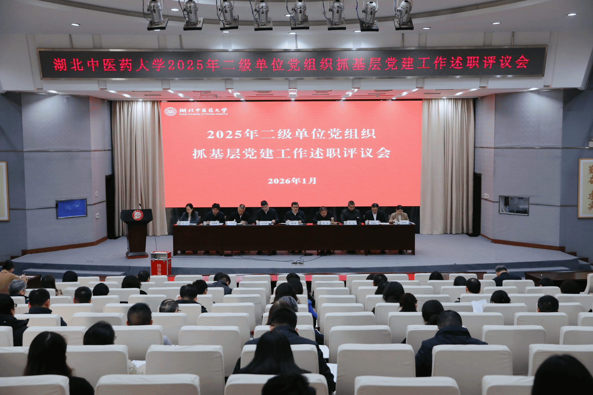 会上,附属医院(湖北省中医院)党委、第一临床学院党委、药学院党委、外国语学院党委、马克思主义学院党总支、直属机关党委、国际教育学院党总支、后勤党总支等7个二级单位党组织书记进行现场述职,其他13个二级单位党组织书记以书面形式述职,总结2025年度基层党建主要工作成效、分析问题不足,提出改进措施。