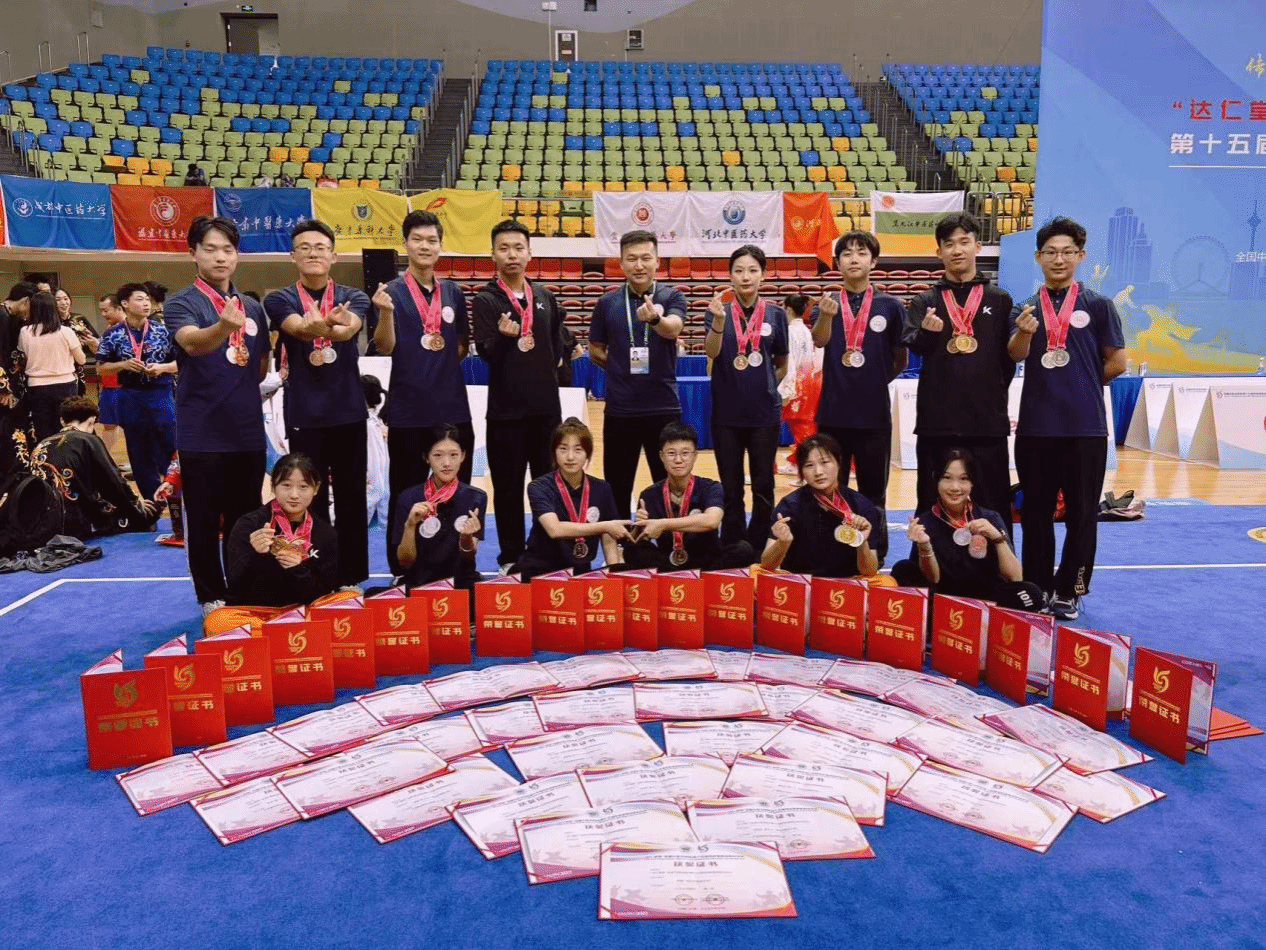 经过赛前积极备战,每日高强度、科学化训练,我校武术队在赛场上奋勇拼搏,斩获金牌3枚、银牌13枚、铜牌5枚,在27支代表团中团体总分位列第四名,获“体育道德风尚奖单位”荣誉称号。优异成绩的取得,离不开学校对传统保健体育的高度重视,也离不开武术队教练员和运动员的辛勤付出。