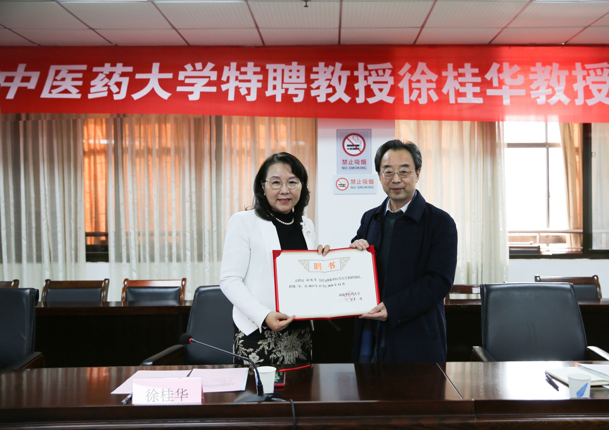 护理学院负责人首先代表学校向徐桂华教授的到来表示真诚欢迎,并对本次柔性引进工作情况作了简单介绍。随后,张子龙为徐桂华教授颁发聘书。