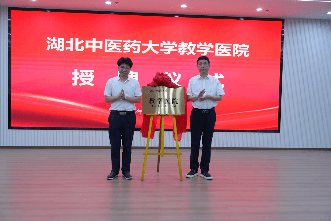 教务处相关负责人宣读《关于确定广水市中医医院成为湖北中医药大学教学医院的决定》。曹继刚代表学校与广水市中医医院党委书记左红涛共同签署合作协议,并为“湖北中医药大学教学医院”揭牌。