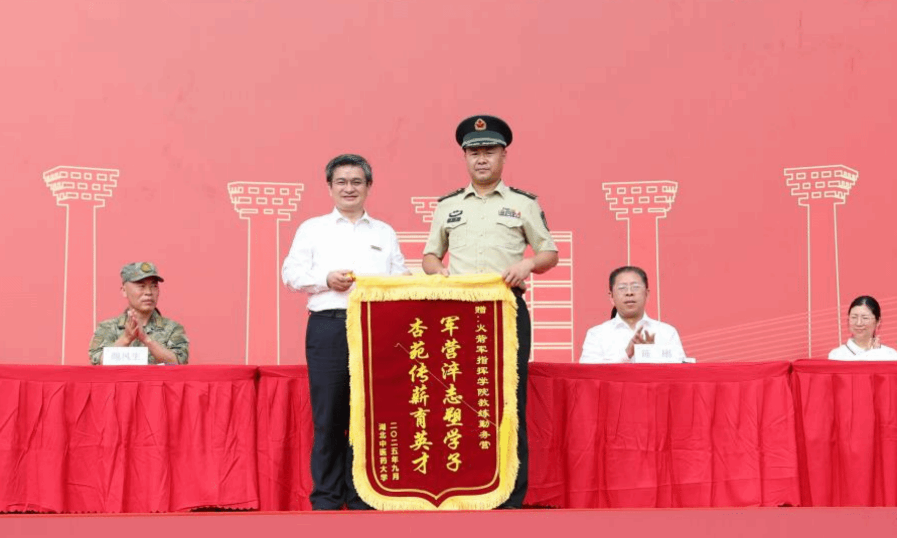 现场,刘松林代表学校,向火箭军指挥学院赠送锦旗,表达对承训部队的诚挚感谢与崇高敬意。