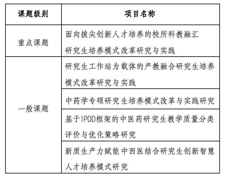 本网讯 近日,2024年全国中医药研究生教育研究课题立项名单正式公布,我校共获批 5 项课题,其中重点课题 1 项、一般课题 4 项。