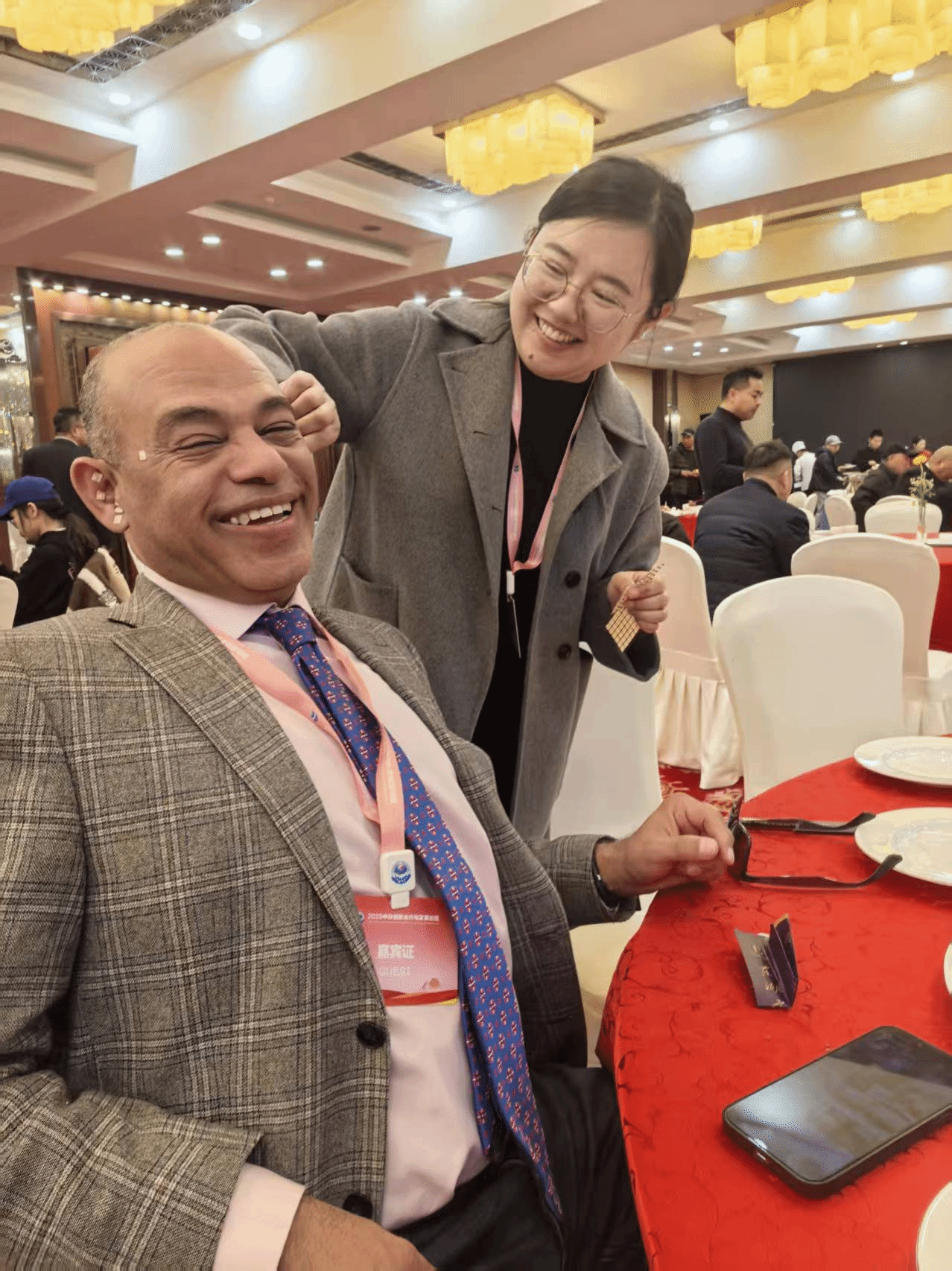 经简短的望闻问切,许海判断其为风寒引起的头痛眩晕,随即提出可采用耳穴疗法进行应急处理。征得同意后,她们现场施治。约两小时过去,侯赛因教授的不适症状显著缓解,他顺利登台完成了报告,并在会后频频竖起大拇指,连声赞叹中医药的独特魅力。