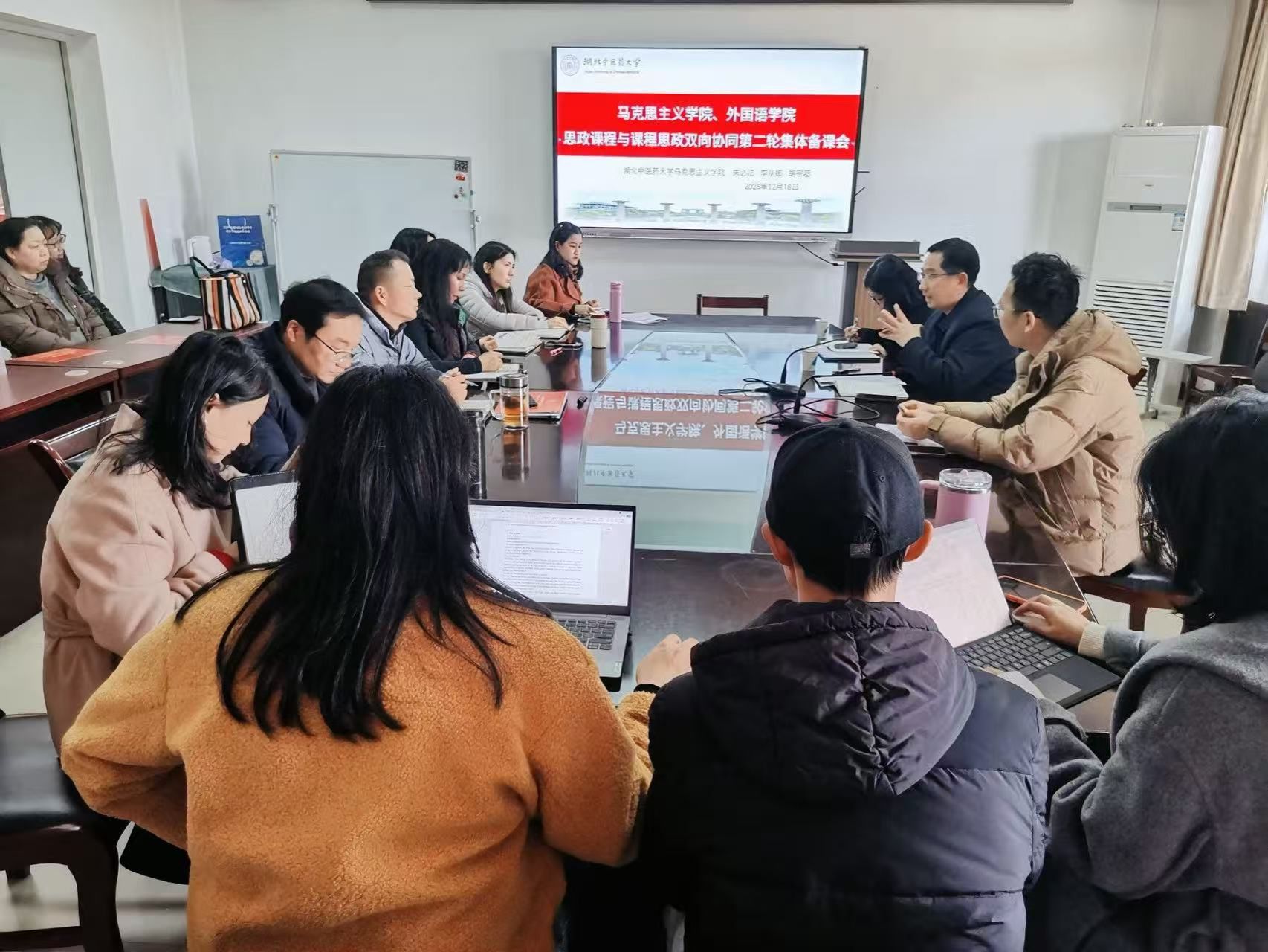 本网讯 近日,马克思主义学院在外国语学院宣讲党的二十届四中全会精神,并开展思政课程与课程思政双向协同集体备课会。马克思主义学院行政负责人、思政教师代表,外国语学院相关负责人、全体教职工及学生代表参加会议。