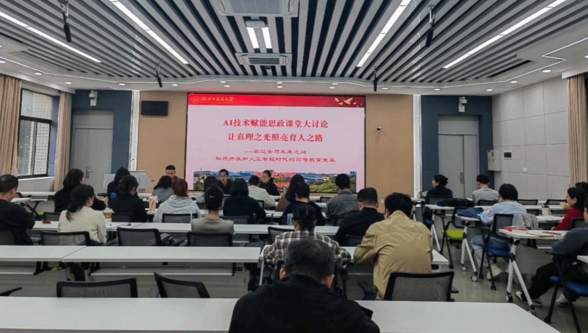 本网讯 4月9日,马克思主义学院在黄家湖校区Y102智慧教室举办“AI技术赋能思政课堂大讨论——让真理之光照亮育人之路”专题研讨活动,此次活动由马克思主义学院行政负责人主持,学院领导班子成员及全体思政课教师参加研讨。