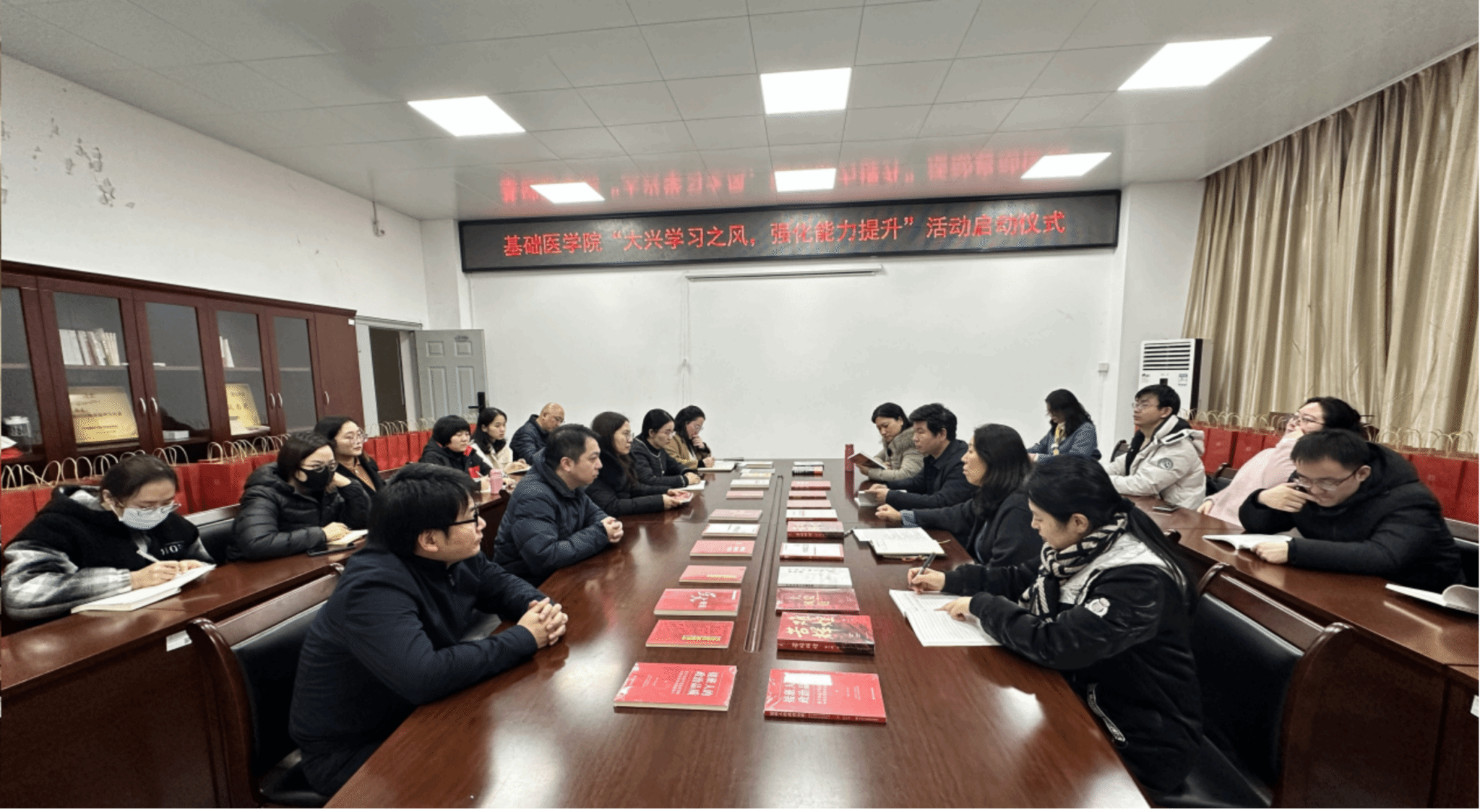 本网讯 为巩固拓展主题教育成果,健全以学铸魂、以学增智、以学正风、以学促干长效机制,1月12日,基础医学院在黄家湖校区杏林阁D103举行“大兴学习之风 强化能力提升”活动启动仪式,旨在通过开展读书学习、组织专题讲座、举行交流研讨、表彰先进典型等形式,引导教职工不断提升政治判断力、政治领悟力、政治执行力,锻造高强本领,以更加奋发有为的精神状态助力学院高质量发展。学院领导班子、教研室主任、党支部书记、“两代表一委员”、人才专家代表参加活动。启动仪式由基础医学院党委负责人主持。