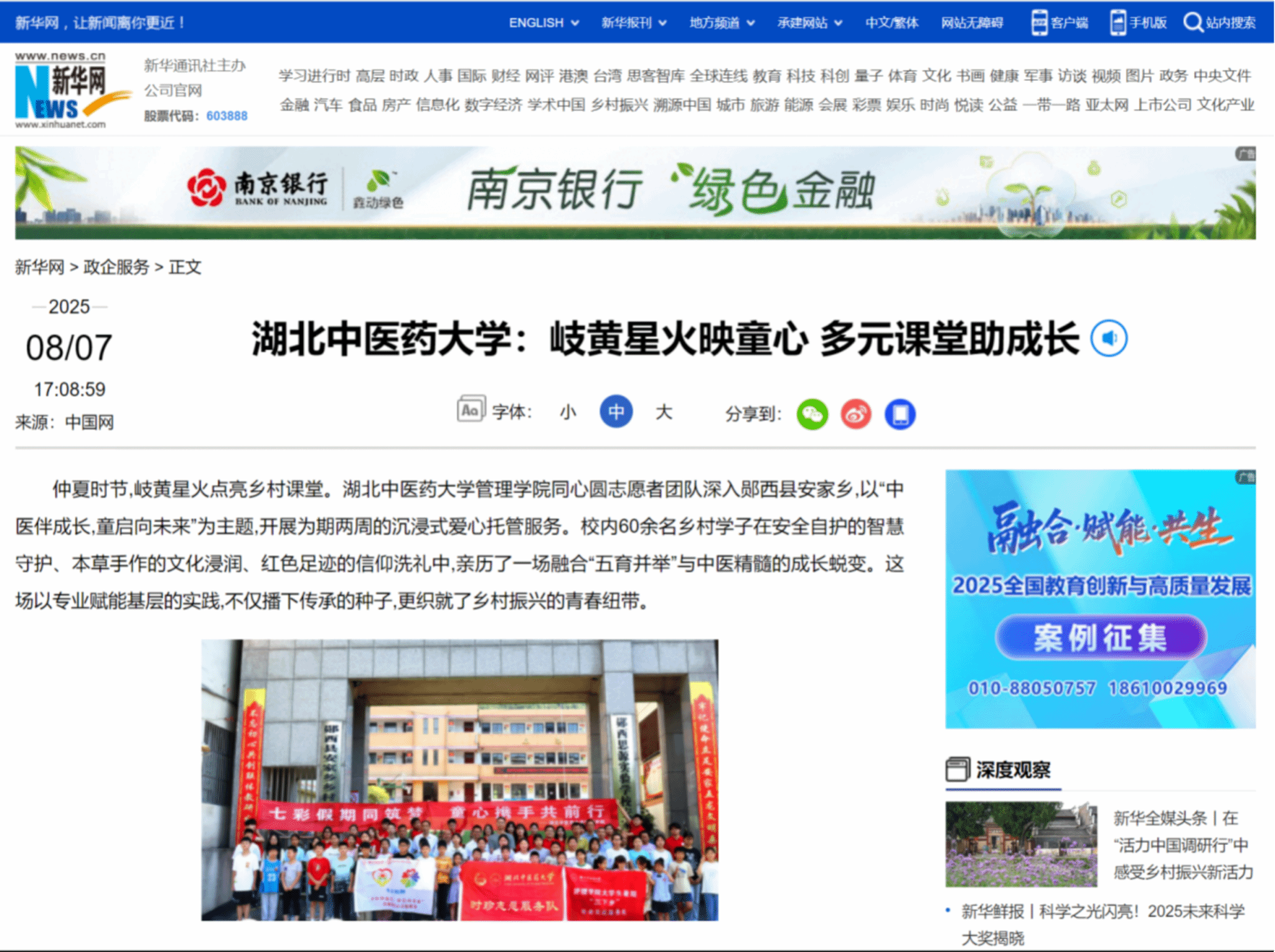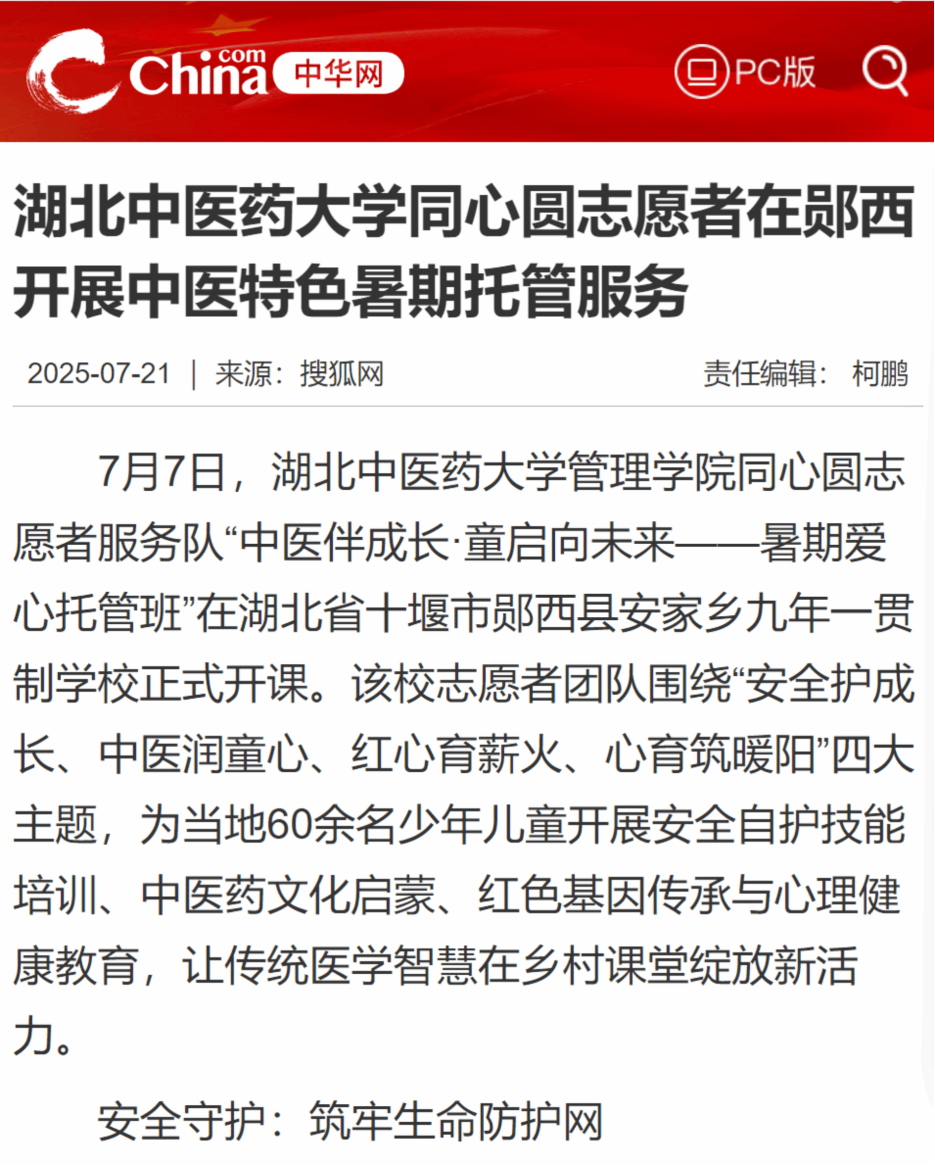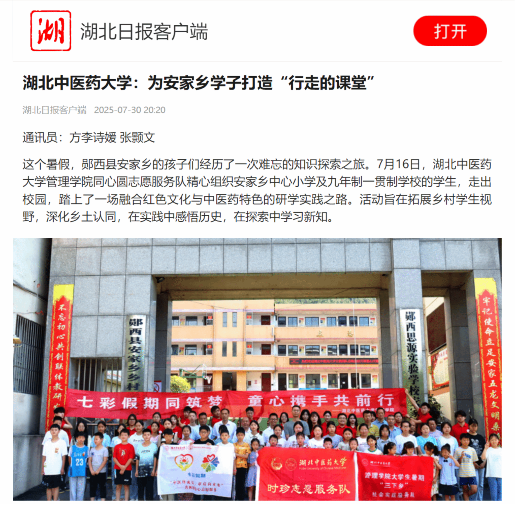 本网讯 近日,新华网、湖北日报、中华网、今日头条分别以《湖北中医药大学:岐黄星火映童心 多元课堂助成长》《湖北中医药大学:为安家乡学子打造“行走的课堂”》《“七彩假期”让乡村儿童体验航天科技与太阳能奥秘》《湖北中医药大学同心圆志愿者在郧西开展中医特色暑期托管服务》《湖北中医药大学管理学院暑期爱心托管班开班仪式在安家乡隆重举行》为题,对管理学院同心圆志愿服务队,深入郧西县安家乡,开展岐黄安康、和韵美育、杏林心育三大主题课程体系、红色研学、参观中草药种植基地等活动进行了详细报道。
