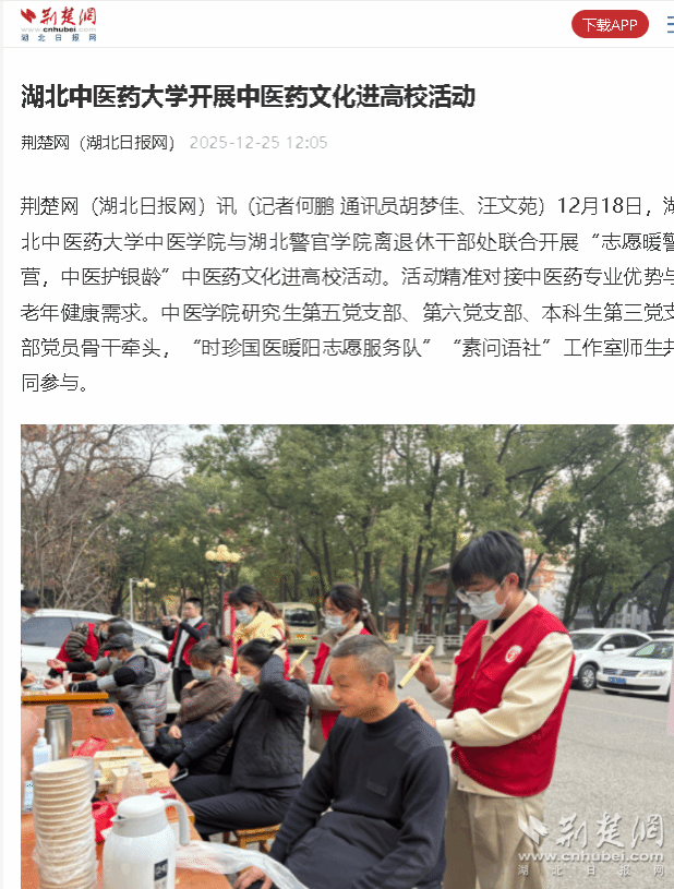 本网讯 近日,湖北日报、荆楚网、长江日报对学校中医学院开展“志愿暖警营,中医护银龄”中医药文化进高校活动,精准对接中医药专业优势与老年健康需求的事迹进行了聚焦报道。链接如下。