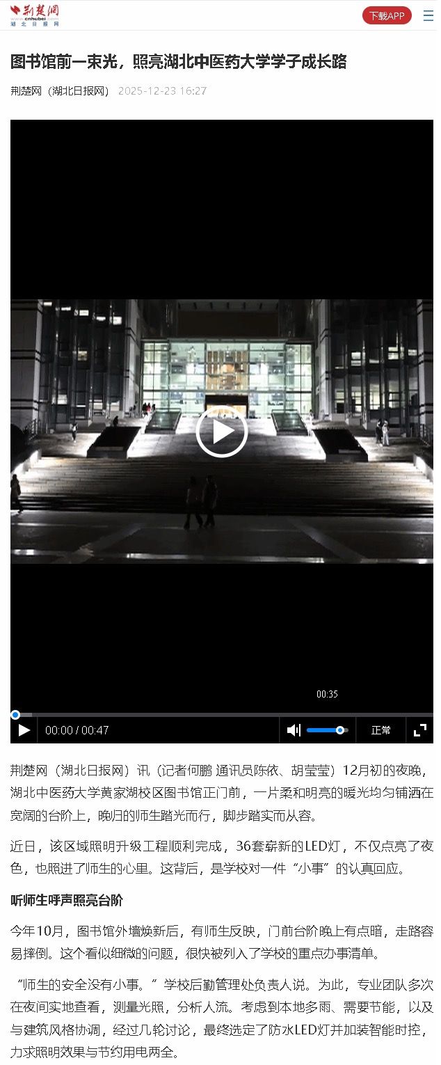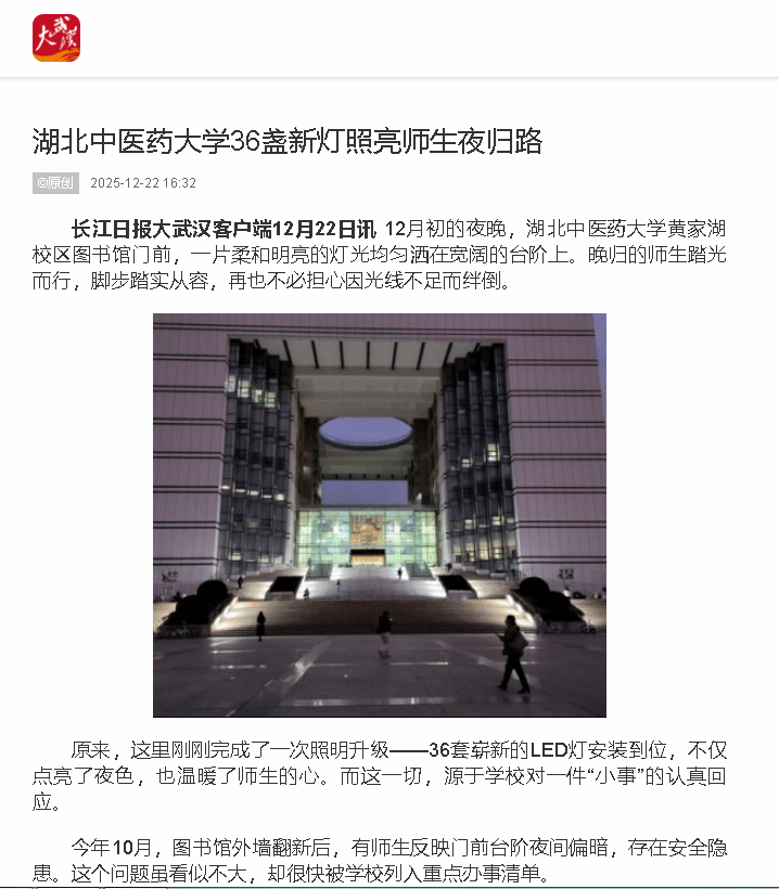 长江日报:湖北中医药大学36盏新灯照亮师生夜归路