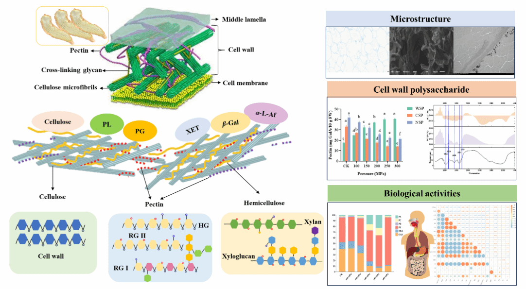 针对天麻干燥过程中能耗高、周期长、热敏性活性成分易被破坏等问题,团队创新引入了高静水压预处理技术,通过非热力处理的物理方式改变鲜天麻微观结构与细胞壁多糖组分,有效减小了天麻组织致密导致的干燥阻力。相关研究成果以“Modification of the microstructure and cell wall polysaccharides alters drying behavior and biological activities of Gastrodia elata by high hydrostatic pressure pretreatment”为题,发表于食品领域权威期刊《Innovative Food Science and Emerging Technologies》(中科院一区Top,影响因子 6.8)。