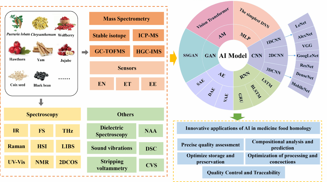 随着人工智能(AI)等前沿技术蓬勃发展,团队提出AI技术有望在药食同源药材原料的智能鉴别、加工过程模拟与优化、活性成分挖掘与功效预测以及个性化产品开发等多个层面引发深刻变革。相关综述以“Artificial Intelligence empowered evolution in medicine food homology”为题,发表于食品领域知名期刊《Food Bioscience》(中科院二区Top,影响因子5.9)。
