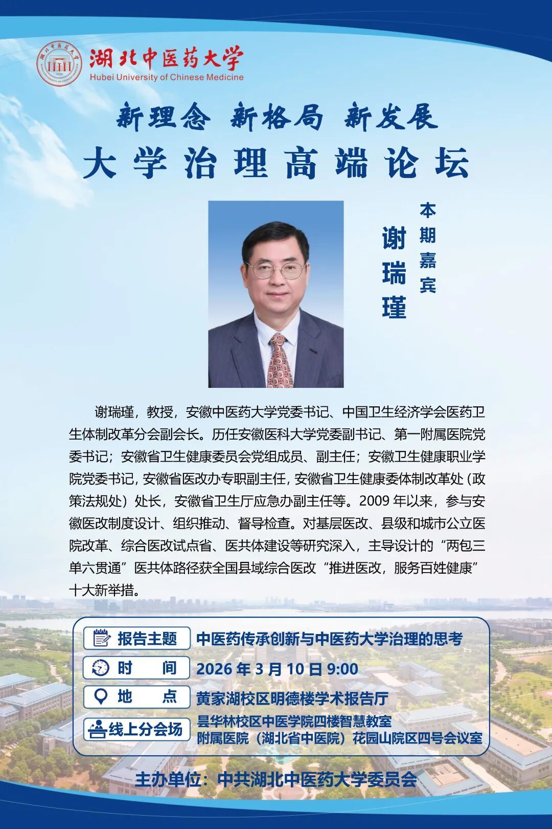 主讲人简介:谢瑞瑾,教授,安徽中医药大学党委书记、中国卫生经济学会医药卫生体制改革分会副会长。历任安徽医科大学党委副书记、第一附属医院党委书记;安徽省卫生健康委员会党组成员、副主任;安徽卫生健康职业学院党委书记,安徽省医改办专职副主任,安徽省卫生健康委体制改革处(政策法规处)处长,安徽省卫生厅应急办副主任等。2009年以来,参与安徽医改制度设计、组织推动、督导检查。对基层医改、县级和城市公立医院改革、综合医改试点省、医共体建设等研究深入,主导设计的“两包三单六贯通”医共体路径获全国县域综合医改“推进医改,服务百姓健康”十大新举措。